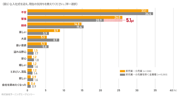 2023年4月、入社式を終えたばかりの新入社員5,623人に、現在の気持ちを単一選択で質問しました。結果、卸売業・小売業の新入社員は、「不安」と回答した新人が33.1%と最も高くなりました。次に、「緊張」が26.0%、「期待」が14.8%と続きました。「緊張」に関しては、卸売業・小売業界を除く全業種(以下、『他業種』と記載)よりも5.1ポイント高い結果になりました。(図1)
