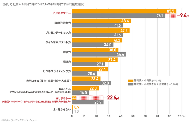 他業種との比較においても「ビジネスマナー」を身につけたいと回答した割合は、他業種より9.4ポイントと1割近く高い結果となりました。なお、卸売業・小売業と他業種とで回答結果に最も差が出た項目は「ITリテラシー」です。こちらは逆に他業種よりも身につけたいと回答した割合は22.6ポイント低く、3.3%の結果となりました。(図3)