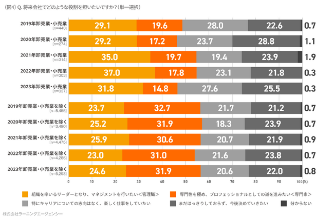 一方、「特にキャリアについての志向はなく、楽しく仕事をしていたい」が27.6%、「まだはっきりしておらず、今後決めていきたい」が25.5%と、それぞれ昨年より4.5ポイント、3.7ポイント増加する結果となりました。リーダー志向が高い傾向にあった卸売業・小売業の新入社員ですが、今年はキャリアについて明確な志向を持っていない割合が増加していることが特徴と言えるでしょう。(図4)