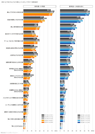 「やりがい」や「自分のペースで仕事ができる」ことを求める卸売業・小売業の新入社員はどのような状況であれば、今の会社で働き続けたいと思うのでしょうか。