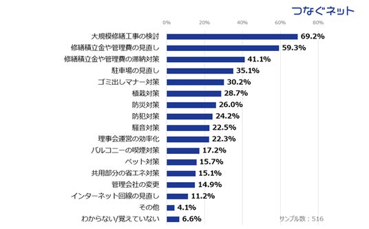 アルテリアグループの株式会社つなぐネットコミュニケーションズ(本社:東京都千代田区、代表取締役社長:臥雲 敬昌、以下:つなぐネット)は、分譲マンションに暮らす住民に対して「マンションの理事会に関するアンケート」を実施しました。つなぐネットではマンションの管理組合の運営改善を目指し、理事会運営における課題や、住民が求めているマンション管理の関心事などを定期的に調査しています。結果は以下のとおりです。