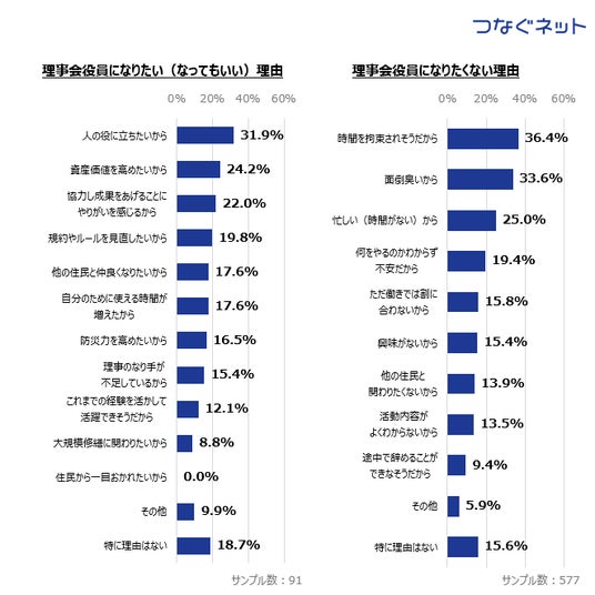 なりたくない理由の上位は「時間を拘束されそう」「面倒臭い」「忙しい(時間がない)」と、時間的負担や煩わしさが並んでいます。一方でなりたい(なってもいい)理由の上位には「人の役に立ちたい」「資産価値を高めたい」「協力し成果をあげることにやりがいを感じる」など前向きなものが多く上がっています。