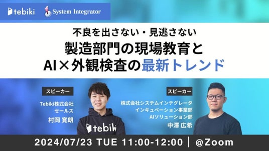 株式会社システムインテグレータ(本社:さいたま市中央区、代表取締役社長:引屋敷 智、東証スタンダード:証券コード3826)は、Tebiki株式会社(本社:東京都新宿区、代表取締役:貴山敬 )と共催で、「不良を出さない、見逃さない、製造部門の現場教育とAI×外観検査の最新トレンド」と題した無料ウェビナーを、2024年7月23日(火)に開催することをお知らせします。