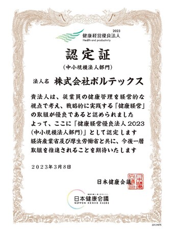 「区分所有オフィス(R)」を主軸に資産形成コンサルティングを行う株式会社ボルテックス(東京都千代田区 代表取締役社長 兼 CEO 宮沢 文彦、以下当社)は、経済産業省と日本健康会議が共同で認定する 「健康経営優良法人2023」(中小規模法人部門)に認定されましたので、お知らせいたします。