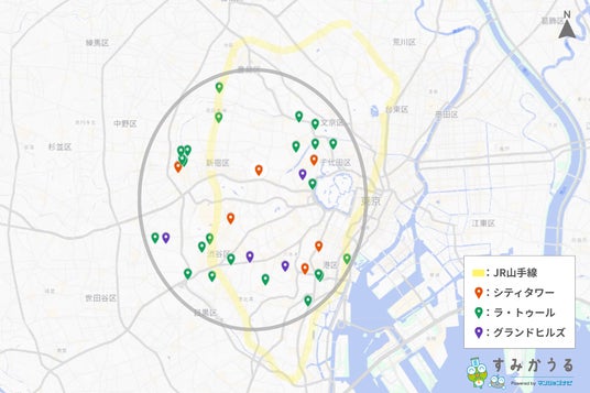画像1:東京都心部におけるラ・トゥール、シティタワー、グランドヒルズの所在をプロットし、JR山手線を目安として同心円状のエリア構造を示した地図(マンションナビ)