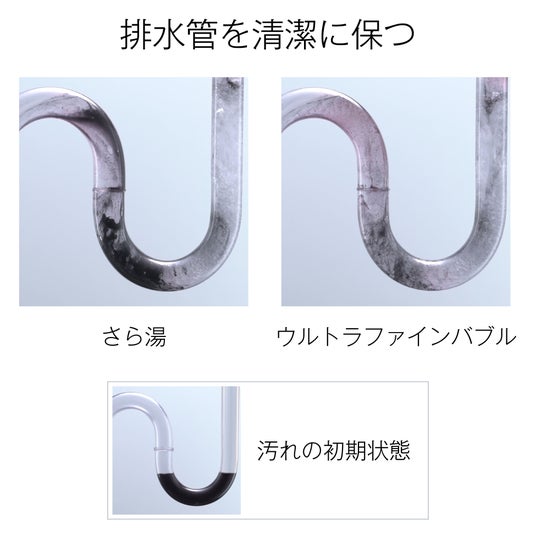 *4 【実験方法】排水管に疑似汚れを溜め、流量7L/分で通水。【実験条件】試験水:水道水、水温:40℃、水圧:200kPa、配管長さ:13A-10mの条件で生成したウルトラファインバブル入りの水を使用。当社調べ。