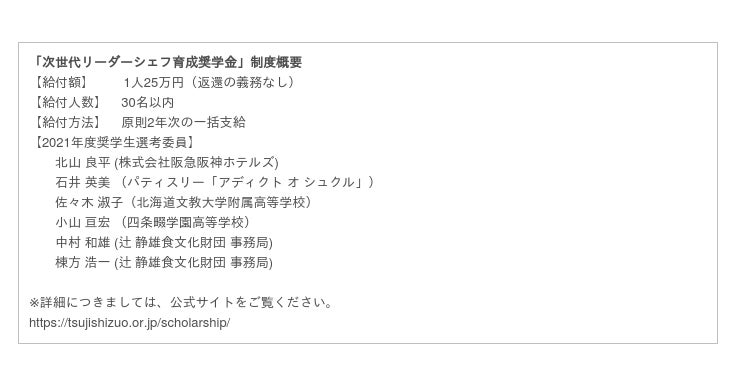 食分野の教育と研究に生涯を捧げた辻調グループ創設者・辻静雄の志を受け継ぎ、2015年に設立された「辻静雄食文化財団」では、全国の高校2年生を対象とした、「次世代リーダーシェフ育成奨学金」の給付を行っております。今年度も厳正な選考を経て、2021年度(第7期)の奨学生として30名を採用いたしました。