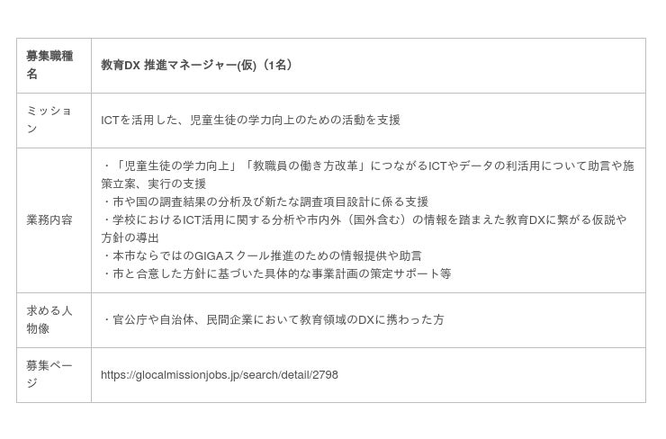 応募条件 :みらいワークスの各種サービスに登録していない方も、「GlocalMission Jobs(GMJ)」にご登録の上、応募いただけます。