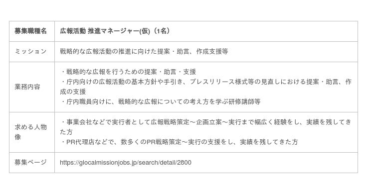 ※「広報分野」のうち、「政策広報動画活用推進マネージャー(仮)」については既に募集期間を終了しています。