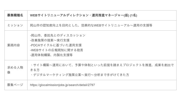 株式会社みらいワークス(本社:東京都港区、代表取締役社長 岡本祥治、以下「当社」)は、岡山県岡山市(市長 大森雅夫)の課題を解決し、岡山市のみらいをつくる「戦略マネージャー」を募集することになりました。テレワークを活用しながら、民間の独立・副業プロフェッショナルの知見を活かしてプロジェクトを推進することで、行政の課題を解決いたします。