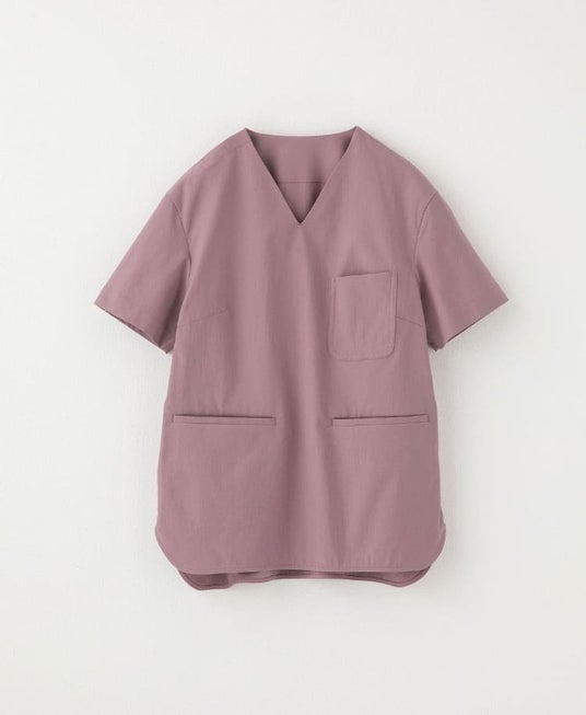 身体のラインを拾わない程よいストレートシルエットで、アクティブながら品格のあるデザインのスクラブ。ヒップにかかるくらいの少し長めの丈感は、しゃがむことが多い現場の業務を考慮しました。裾のカーブラインは柔らかな雰囲気を演出します。