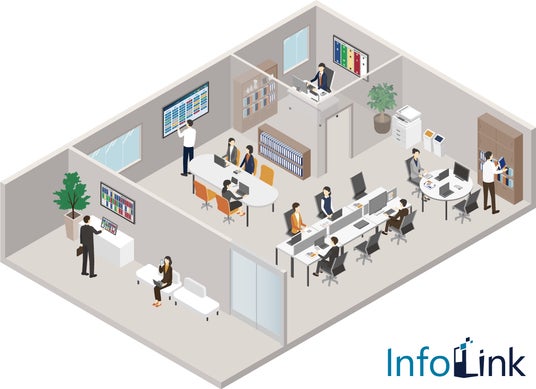 「InfoLink」は、社員の出勤・退勤・外出・在席状況などをデジタルサイネージやWeb画面を通じて分かりやすく可視化します。これにより、職場内でのスムーズなコミュニケーションを促進するとともに、業務効率化を支援します。