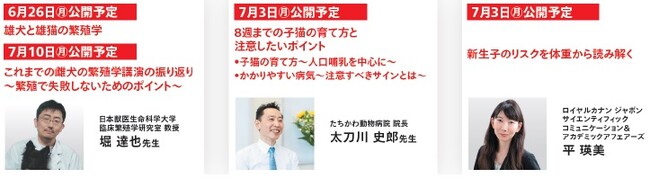 「PROFESSIONAL SEMINAR」は、ブリーダー・シェルター・訓練所等の犬と猫の専門家の皆様と共に、犬と猫を取り巻く環境の向上とビジネスの持続的な発展を目的として、ロイヤルカナンが提供している学術セミナーです。犬と猫の栄養学、繁殖学、行動学、衛生管理などをテーマに、大学教授や獣医師などによる講演を専門家の皆様との知識の共有の場として開催しています。今回の「PROFESSIONAL SEMINAR in 2023」では、犬と猫の健やかなバース(誕生)とグロース(成長)をサポートするために必要な学術知識として、交配適期や精液検査といった繁殖学、ならびに人工哺乳や低体重のリスクといった新生子学について、3名の講師による8本のセミナーを提供します。