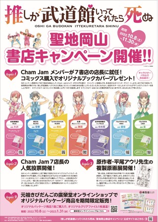 このたび、2022年10月からの実写ドラマ化に合わせて、当作品の周知拡大と書店店頭の盛り上げを目的として、原作の舞台である岡山県の書店7店舗にてキャンペーンを実施することとなりました。7店舗それぞれで期間限定店長に就任するChamJamのメンバーを、書店店頭で応援する企画です。対象コミックをご購入のお客様に、7店舗ごとに異なるデザインの限定オリジナルブックカバーをお渡しするほか、期間中の対象コミックの販売総数によって人気店長第1位を決定します。なお、遠方のファン向けに、SNS上での人気投票も行います。