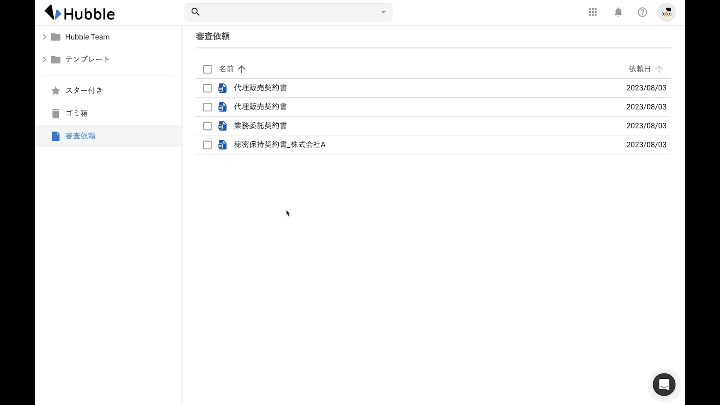 Hubble上で契約書の審査依頼ができる機能です。入力された情報はドキュメントリスト(※1)にも反映され、台帳入力の工数も削減できます。また、フォームは任意で詳細項目の設定・作成ができるため、自社に合った使い方でご利用いただけます。これまで「審査受付時の依頼内容がルール化されておらず、必要情報の再ヒアリングなどでコミュニケーションコストが発生する・・・」「案件管理台帳の作成に時間がかかる」「依頼方法がメールやチャット、口頭などバラバラで、案件管理が困難。」といった悩みを抱えていた方々に、特に便利にお使いいただける機能となっています。