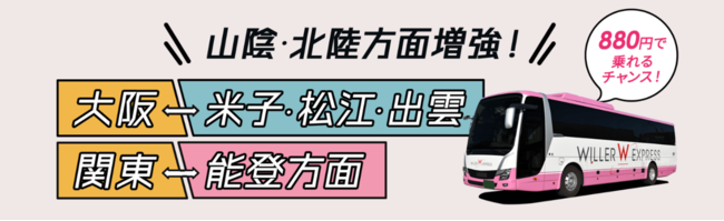 WILLER EXPRESS 株式会社(本社:東京都江東区、代表取締役:平山幸司、以下「ウィラーエクスプレス」)が統括管理・運行する高速バス 「WILLER EXPRESS」は、2022年 7月より「大阪~米子・松江・出雲線」の運行を開始するとともに、「東京~富山・金沢線」を能登エリアまで延伸します。それに先駆け、本日6月27日(月)より予約サイト「WILLER TRAVEL」にて予約受付を開始するとともに、運行開始を記念したお得なキャンペーン(https://travel.willer.co.jp/campaign/newrosen/)を実施します。