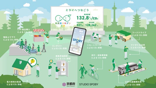 株式会社スタジオスポビー(東京都中央区、代表取締役:夏目恭行)と京都府は、2025年3月17日(月)に事業連携協定を締結し、京都府内の事業者の従業員や府民の脱炭素型ライフスタイルの意識醸成と行動変容を促進することを目指すプロジェクト「脱炭素エキデン京都」を発足しました。当プロジェクトでは、日々の生活における脱炭素活動をCO2削減貢献量として可視化する「SPOBY」の提供を通じて、ユーザーに具体的な脱炭素アクションを提案、そして浸透を図ります。