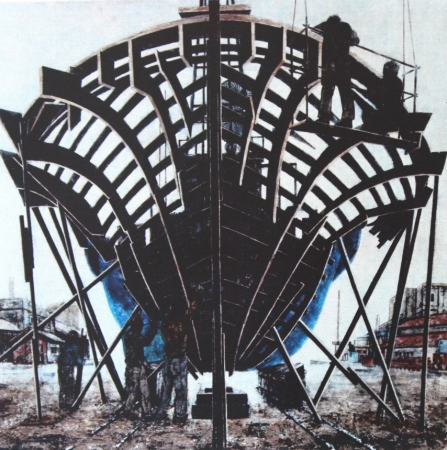 今から150年前に新潟港は開港しました。港は船によって世界に繋がっています。新潟市には外洋を航行する船を造る造船所が二つあります。日本美術院院友の渡辺富栄氏は、柳都大橋たもとにある造船所で「船を造る人々」というテーマで日本画作品を描き続け25年になります。