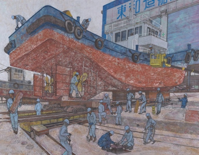 「当時、片岡球子先生から指導していただいていました。先生からは若い人は人物を勉強しなければだめと言われていました。造船所に行き、絵を描かせて下さいとお願いして描いた作品が、院展に入選しました」と渡辺氏。作品からは大きな船体に取り組む働く人々の姿と、鉄板やアルミ板を加工する火花、騒音、塗料の匂いとともに船を造る人々の誇りが伝わってきます。