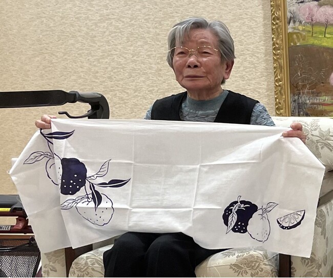 特別養護老人ホームレクロス広尾では贈呈式が行われ、110名の入居者を代表して3名が受け取りました。施設職員からお一人お一人に手拭いをお渡しすると、受け取った入居者は嬉しそうな表情で手拭いを広げ、皇后陛下のお気持ちが込められたお見舞いに対し、感謝の声が上がりました。