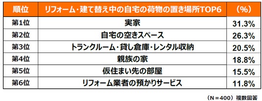 リフォーム・建て替え中に荷物を収納していた場所について聞いたところ、最も多く挙げられたのは「実家」(31.3%)となりました。