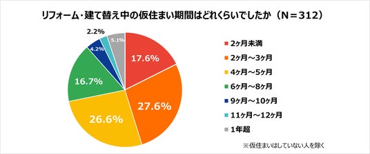 仮住まいの期間について尋ねたところ、最も多かったのは「2か月~3か月」(27.6%)で、次いで「4か月~5か月」(26.6%)、「2か月未満」(17.6%)という結果となりました。全体の約72%が「5か月以内」で仮住まいを終えていることがわかりました。