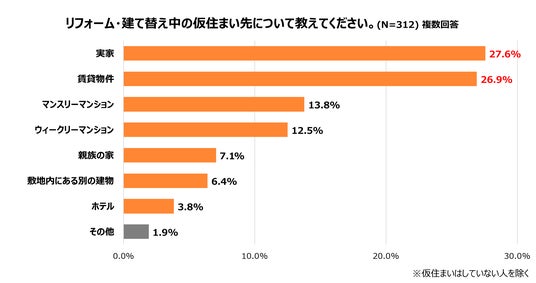 リフォーム・建て替え中の自宅の荷物の置き場所について尋ねたところ、「実家」(27.6%)が最多で、「賃貸物件」(26.9%)、「マンスリーマンション」(13.8%)、「ウィークリーマンション」(12.5%)と続きました。「親族の家」(7.1%)、「敷地内にある別の建物」(6.4%)、「ホテル」(3.8%)といったケースも一部に見られました。仮住まい中の荷物置き場として「身近な人や場所」に依存する傾向が強い一方で、賃貸や短期滞在施設など有償の手段を選ぶ人も一定数存在することが分かります。