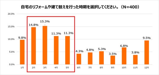自宅のリフォームおよび建て替えの実施した時期について尋ねたところ、最も多かったのは3月で15.3%、次いで2月が14.8%、4月と5月がそれぞれ11.3%となりました。