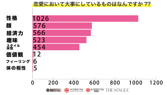 男女ともに清潔感や笑顔という外見からの第一印象が強いものの、実際恋愛において大事にしているものと聞かれると、性格、経済力、趣味などの意見も多数あがりました。