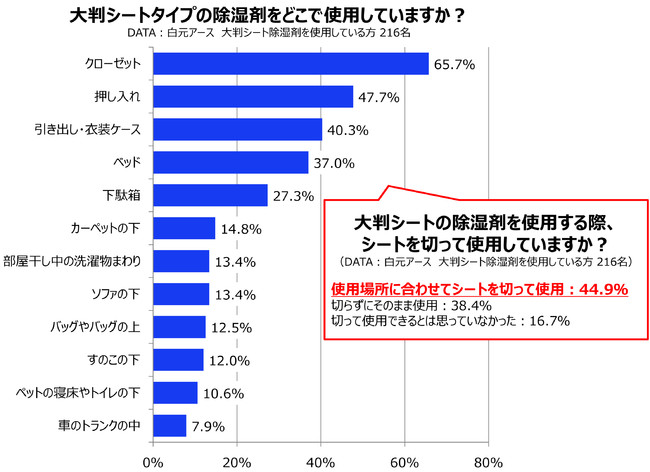 当社が大判シートタイプの除湿剤ユーザーに“使用場所”について調査したところ、様々な場所で使用されていることが分かりました。また、4割以上の方がシートを切って使用していることも分かりました(下図参照)。