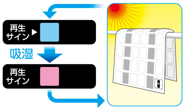 再生サインの色がブルーからピンクに変わったら、直射日光下で半日以上天日干しを行ってください。