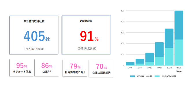 認定を取得いただいた企業様の更新率は90%以上と高く、多くの企業様に認定取得後の採用活動などに大きなメリットを感じていただいています。