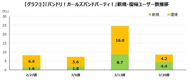 アップデートが行われた3月13日週に増加したユーザーの合計数は24.7万人ですが、そのうち【復帰】ユーザーが16.0万人、【新規】ユーザーが8.7万人となっており、全体の3分の2近くは【復帰】ユーザーであることが分かりました。【グラフ3.】