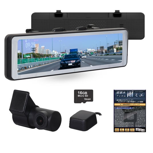 本体、 リアカメラ、リアカメラコード(ケーブル長10m)、GPSアンテナ(ケーブル長2.0m)、シガー電源コード(ケーブル長4.5m)、リアカメラ用両面テープ予備×1枚、microSDカード16GB、ドライブレコーダー本体固定バンド×2枚、雨ミエ、取扱説明書(保証書付き)