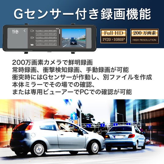 常時録画、衝撃監視録画、手動録画に対応。衝突時にはGセンサーが作動し、別ファイルを作成。