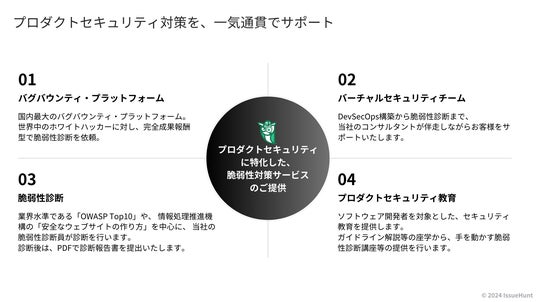 IssueHunt株式会社は、ミッション「才能と機会の媒介になり、全てのクリエイターの努力や貢献が報われる経済圏を作ること」、ビジョンである「日本のサイバーセキュリティのレベルを一段階引き上げる」を実現するために、バグバウンティ・プラットフォーム「IssueHunt」や、バーチャルセキュリティチーム等の提供を行っています。