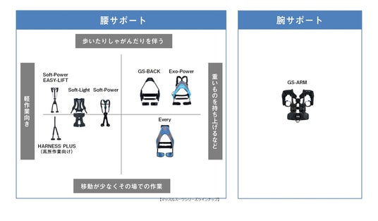 ■マッスルスーツ Soft-Power (ソフトパワー)電気不要。屋内外問わず、様々な作業シーンで活躍する、サポータータイプのマッスルスーツです。マッスルスーツシリーズで培った人工筋肉のアシスト技術をサポーターの背面部に組み込むことで、サポータータイプでは最強クラス※1の補助力を実現。腰の負担を35%※2軽減します。製造・物流倉庫での持ち上げ・持ち運び作業や、介護現場でのつらい姿勢維持、農作業の前傾姿勢など腰に負担のかかる作業で効果を発揮します。