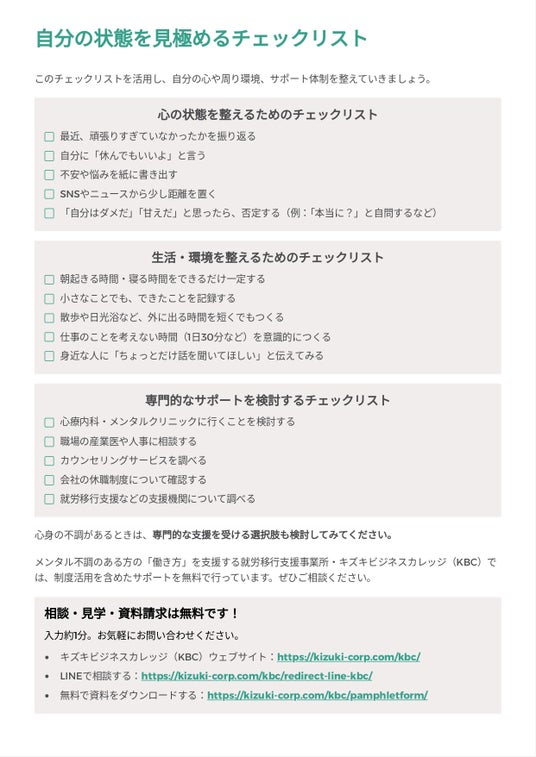 就労移行支援事業所・キズキビジネスカレッジ(KBC)は、「仕事に行けないのは甘えなのか」と悩む方に向けて、自分の状態を見直し、無理なく働くためのヒントをまとめた無料ガイドの配布を開始しました。