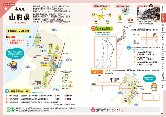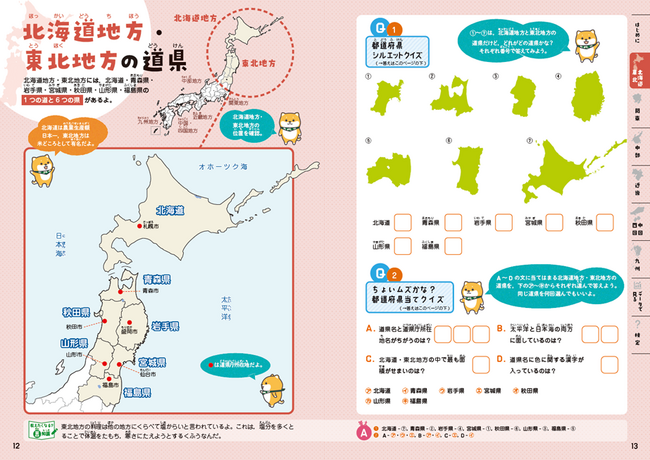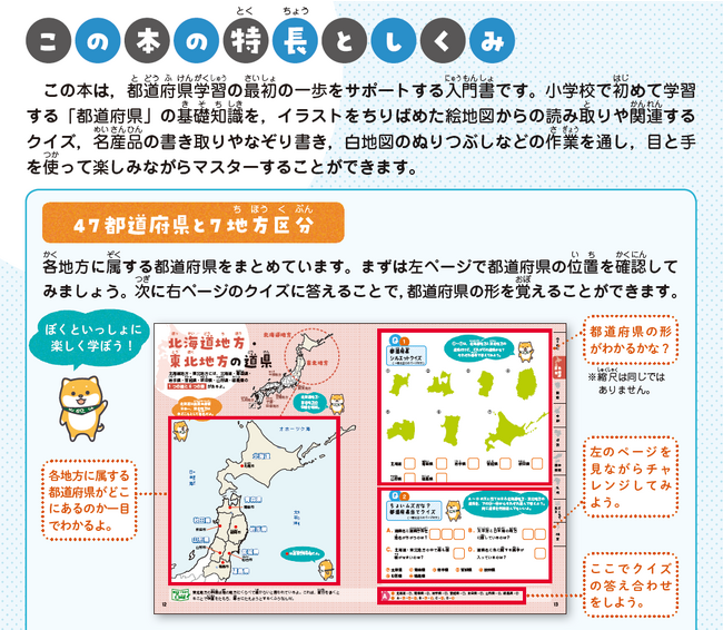 各都道府県ゆかりのご当地キャラをそれぞれのページに掲載し、キャラクターからも各都道府県の特徴を知ることができます。また、柴犬がヒントやポイントを示し、学習をサポートします。
