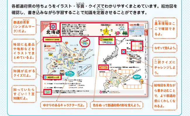 都道府県の学習では、イラストをちりばめた絵地図からの読み取りや関連するクイズ、名産品の書き取りやなぞり書き、白地図のぬりつぶしなどの作業を通して、各都道府県の特徴をつかんでいきます。