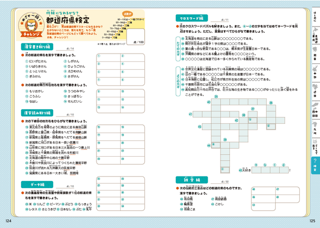 一通りの学習を終えたら、書き取り・読み取り・クロスワードなどのクイズ100問の都道府県検定に挑戦。わからないところは各都道府県のページに戻って確かめながら、くりかえし取り組むことができます。