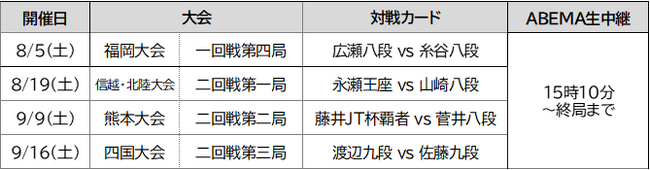 本年度の「将棋日本シリーズ JTプロ公式戦」(以下「JT杯」)一回戦第四局福岡大会は2年ぶり8回目出場の広瀬章人八段と3年連続6回目出場の糸谷哲郎八段の戦い。公開対局として、事前抽選で当選した観戦者や同会場で開催される「テーブルマークこども大会」の参加者等の目の前で対局が繰り広げられる。またその模様は15時10分からABEMAでも生中継される。一回戦第四局生中継「ABEMA」URL https://abema.tv/channels/shogi/slots/AFQZbtLHWHPEzs