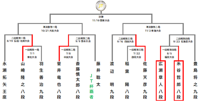 両者の対戦成績は、21戦して広瀬八段の16勝5敗。戦型は、最初の4局は広瀬八段が中飛車や四間飛車と振飛車を採用したが、その後広瀬八段が居飛車党に転向してからは、糸谷八段が後手向かい飛車を1回採用しただけで残り16局はすべて相居飛車の将棋となっている。うち角換わりが11局、先手広瀬八段の矢倉模様が2局、雁木が2局、横歩取りが1局。角換わりの内容は、先手早繰り銀が9局と圧倒的に多く、相腰掛け銀が2局。どちらが先後になっても両者申し合わせたかのように早繰り銀を採用しているのが目立っていることから、角換わり、その中でも早繰り銀になる公算が高いと思われる。両者の「JT杯」での対戦は初めて。持ち時間の短い早指し棋戦での対戦は2局で、こちらは1勝1敗の五分。両者は奨励会同期、お互い竜王のビッグタイトルを獲得したことがあるなど共通点も多い。糸谷八段がどこかで定跡から外れる工夫を見せ、それに対し広瀬八段がどう迎え撃つのか。序盤からスリリングな駆け引きが展開される注目の一戦だ。