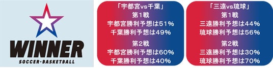 本日は、準決勝の対戦カードである「宇都宮ブレックス vs 千葉ジェッツ」、「三遠ネオフェニックス vs 琉球ゴールデンキングス」の第1戦および第2戦の1試合予想の投票状況を紹介いたします。なお、各試合、試合開始10分前まで販売いたします*。