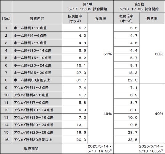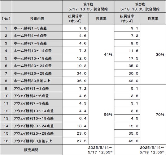 ※1 5月16日(金)11時時点の投票状況となります。払戻倍率(オッズ)は、投票状況により販売終了まで変動します。払戻倍率(オッズ)は、スポーツくじオフィシャルサイト(https://www.toto-dream.com/)で随時更新しています。