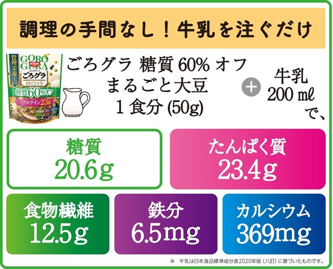 1食50gに牛乳200mlを加えた場合、「糖質60%オフ まるごと大豆」では23g、「糖質60%オフ チョコナッツ」では20gをとることができます。糖質を抑えるだけでなく、たんぱく質を特にしっかりとりたいという方におすすめです。