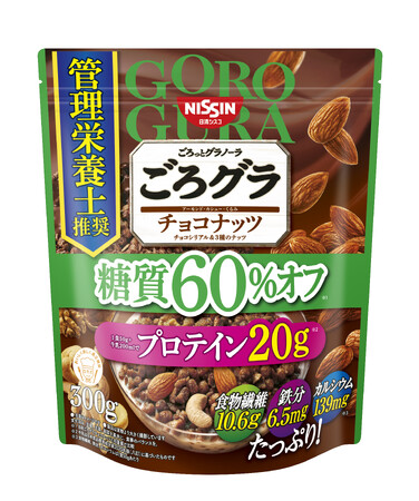 レギュラー品(「ごろグラ まるごと大豆」「ごろグラ チョコナッツ」「ごろグラ 彩り果実」とそれぞれ同重量で比較)と比べて、まるごと大豆、チョコナッツは、糖質を60%オフ、彩り果実は50%オフ。調理の手間なしで牛乳や豆乳、お好みの植物性ミルクを注ぐだけで忙しい朝にも手軽に用意可能。グラノーラの糖質が気になる方も安心して食べることができ、ザクザク食感のシリアルなので満足感もしっかり得ることができます。