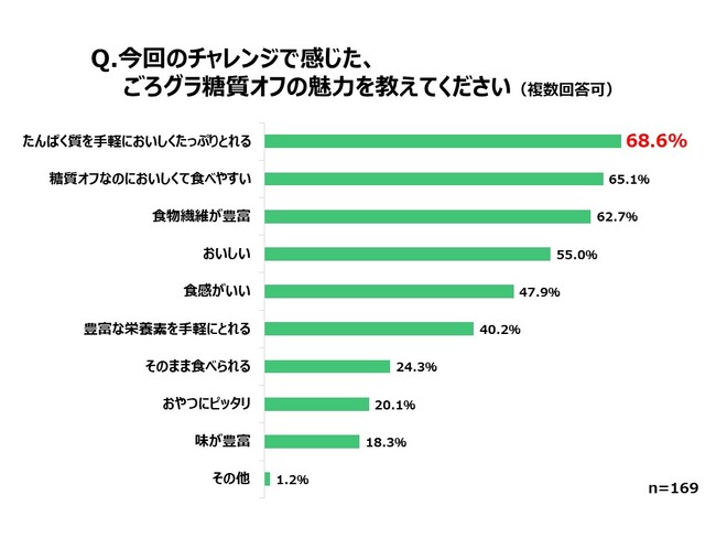 ・「ごろグラ糖質オフ」の魅力トップ3は、「たんぱく質を手軽においしくたっぷりとれる」、「糖質オフなのにおいしくて食べやすい」、「食物繊維が豊富!」さらに、69%が「ごろグラ糖質オフ」をこれからも継続したいと回答!