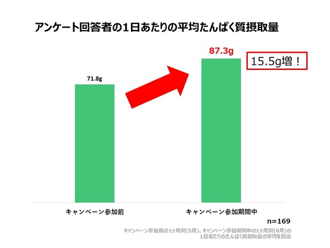 ・89%が「ごろグラ糖質オフ」に含まれているたんぱく質の量に「満足」「やや満足」と回答!さらに、キャンペーン参加前と比べ、1日あたりの平均たんぱく質摂取量が15.5g増加!