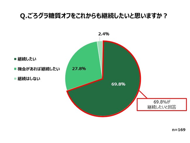 調査方法:【“ごろグラ糖質オフ”7日間チャレンジ!】として、日清シスコの「ごろグラ糖質オフ」シリーズの任意のフレーバーを購入したカロミルユーザーの中から、合計7日間以上喫食登録をした169人に対し、WEB上でアンケートを実施